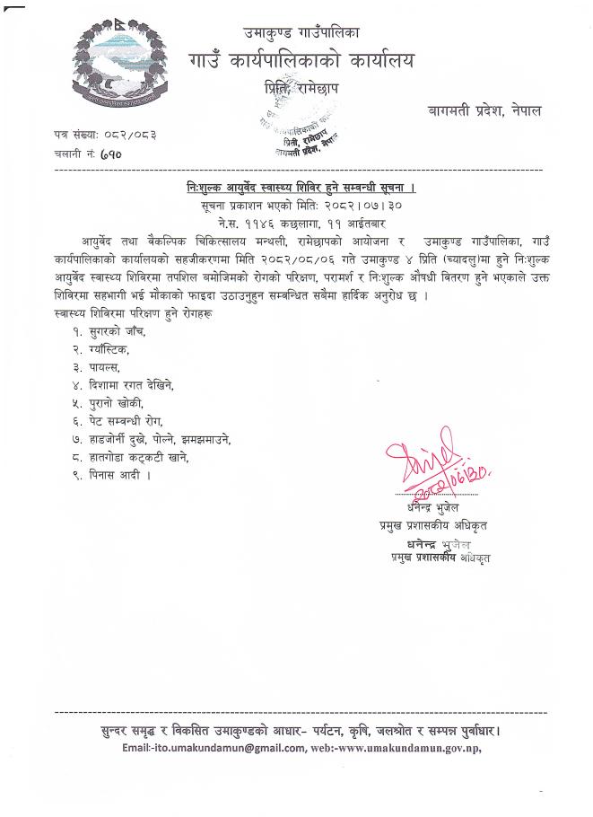 निशुल्क आयुर्वेद स्वास्थ शिविर हुने सम्वन्धी सूचना ।