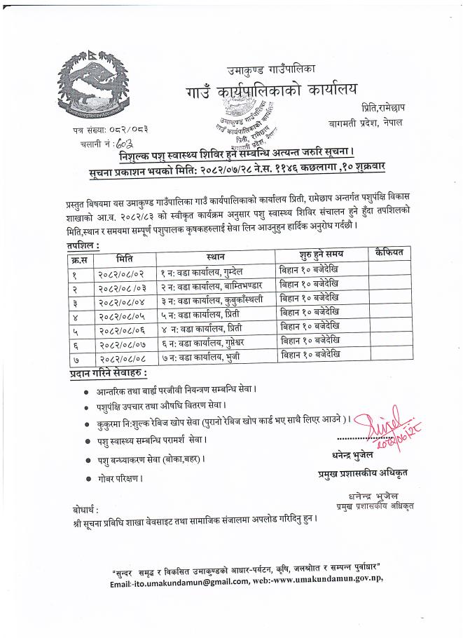 निशुल्क पशु स्वास्थ्य शिविर हुने सम्बन्धी सूचना ।